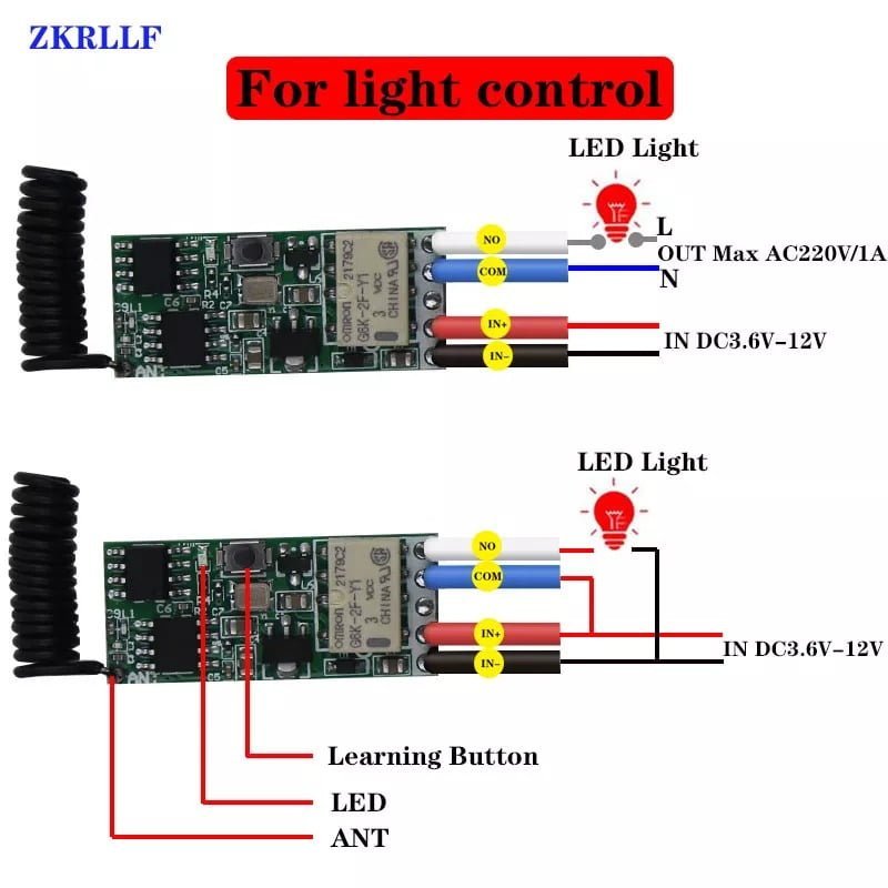 Método de operación: Función de borrado de códigos: Presione el botón de aprendizaje 9 veces consecutivas. El LED parpadeará 5 veces y luego se apagará, indicando que el borrado ha sido exitoso. Esto eliminará todos los códigos de botones de control remoto aprendidos anteriormente. (Nota: Si es necesario cambiar el modo de funcionamiento del mismo control remoto, borre los códigos primero y luego proceda a aprender nuevamente).